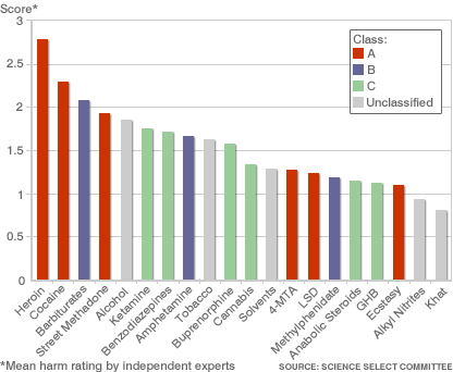 The Class of a drug appears to have little to no relation to its actual danger. Although heroin and cocaine, both Class A drugs, received the highest harm ratings, other Class A drugs (ecstasy, LSD, and 4-MTA (an amphetamine derivative)) were rated as being less harmful than alcohol or even tobacco. In fact, of the twenty substances surveyed, alcohol was (it pains me to say) ranked the fifth most harmful.